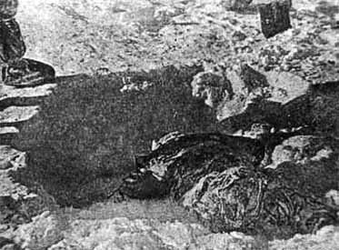 Тело Игоря Дятлова после откапывания из снега. При первом же взгляде на фотографию обращают на себя внимание расханутая меховая безрукавка и поза, никак не соответствующая "позе зябнущего человека".